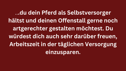 Egal, ob dein Pferd dort im Offenstall 24 Std. wohnt oder nur tagsüber dort Auslauf hat und nachts in einer Box ist.